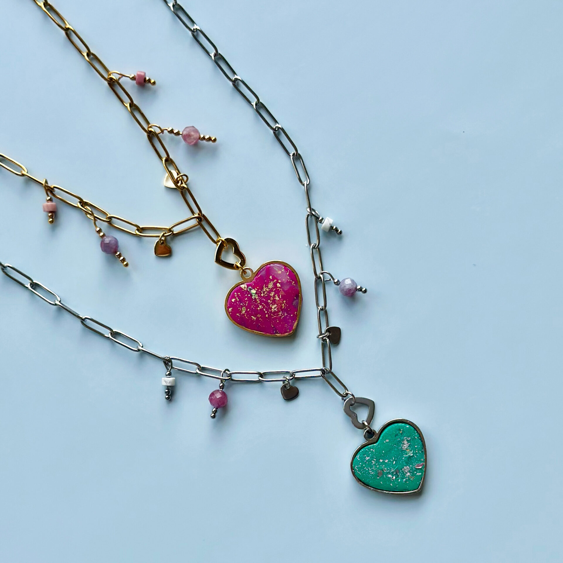 At its center is a handcrafted polymer clay heart, gently accented with sparkles that catch the light like tiny wishes. Each charm is shaped and finished by hand, so no two necklaces are exactly alike — making yours as unique as the bond it represents.