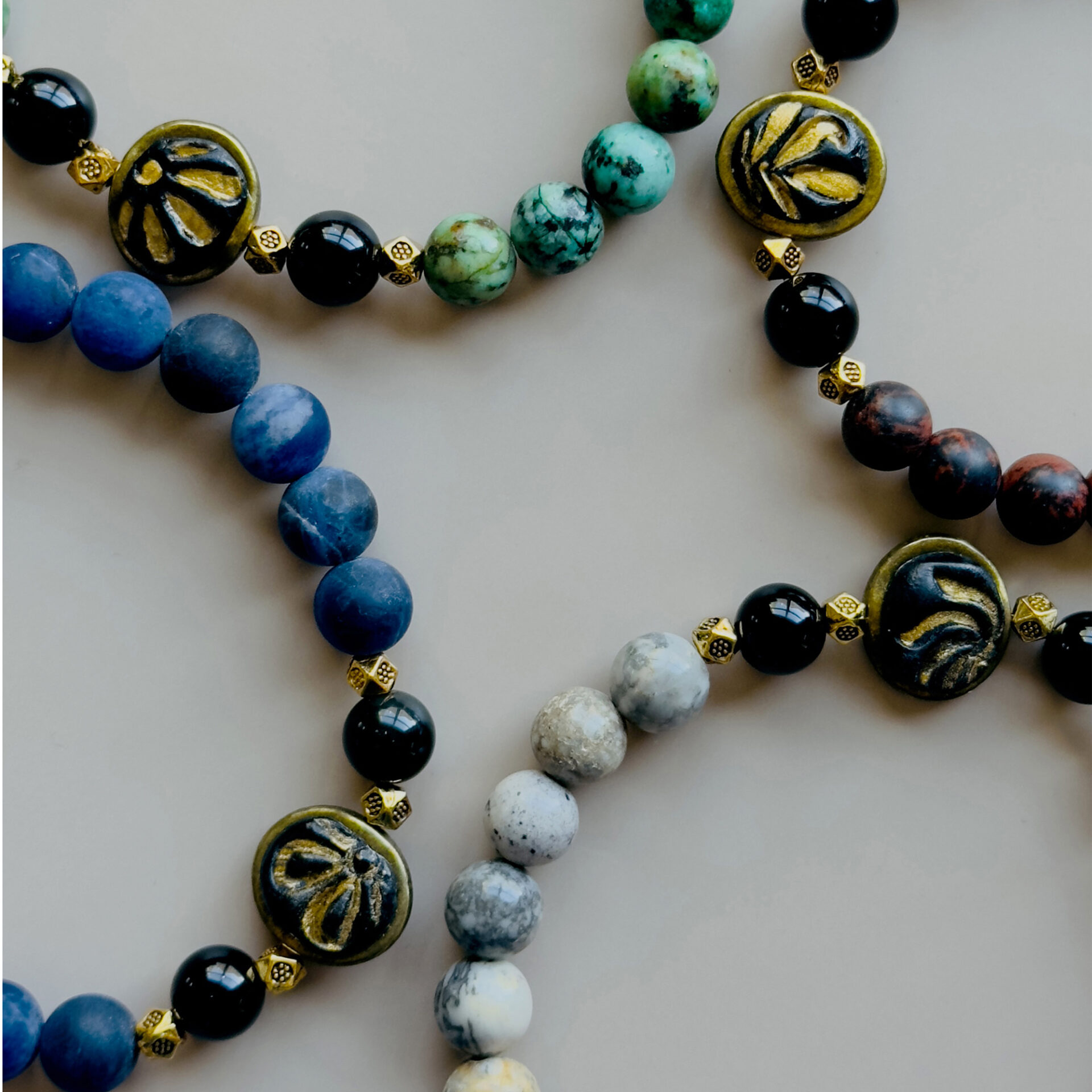 Each bracelet is handcrafted from matte natural stone beads, chosen not only for their tactile beauty but also for their deep elemental and gemstone symbolism: