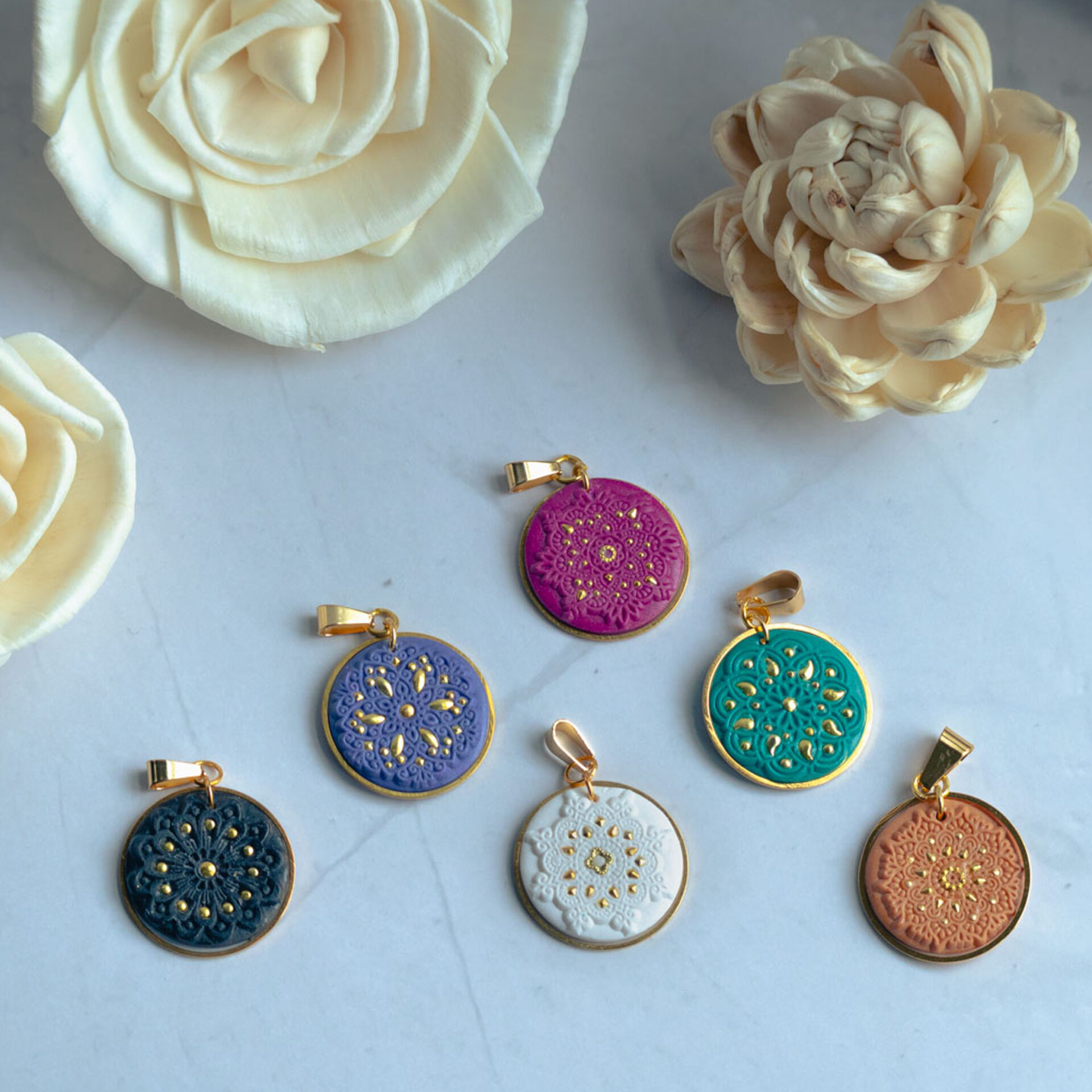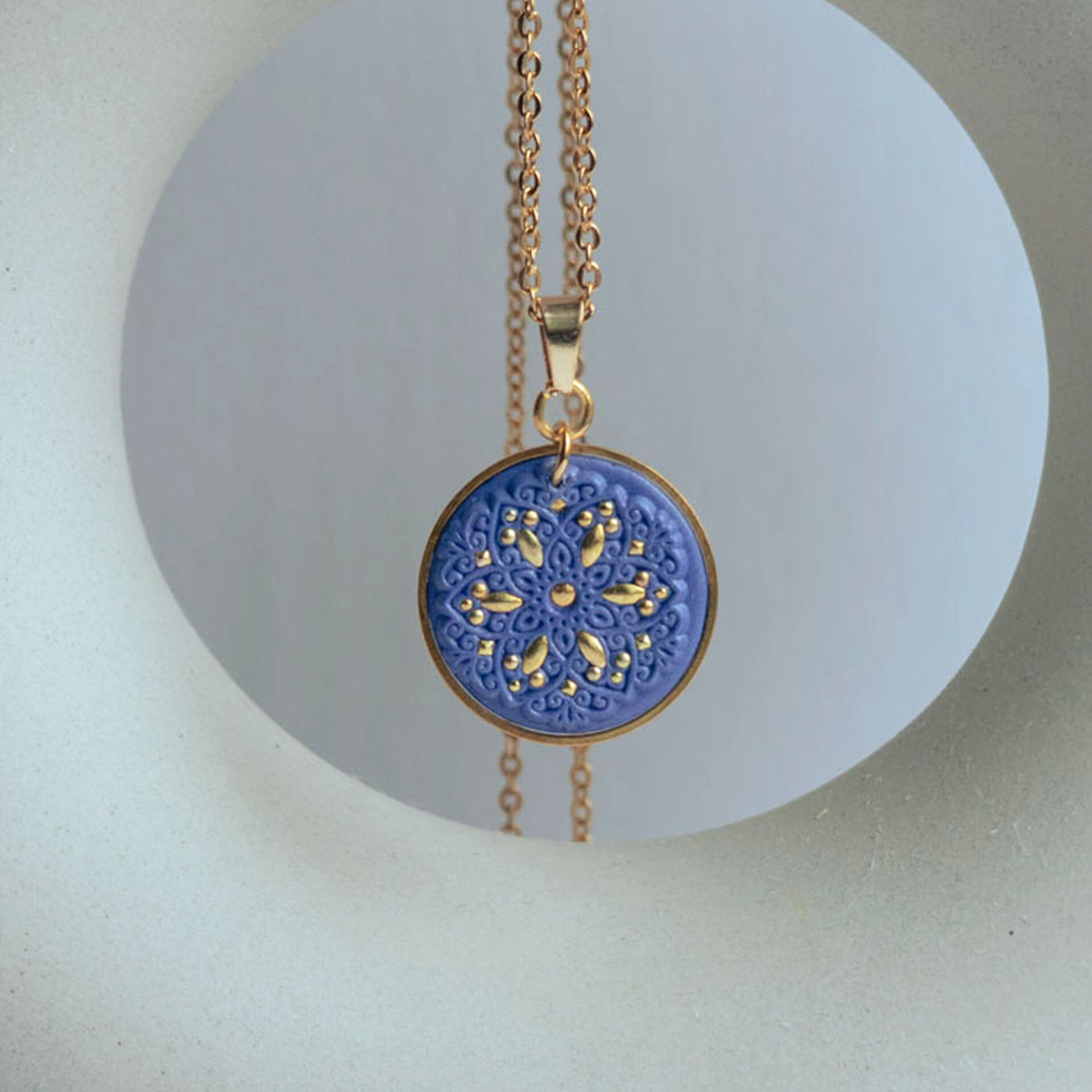 The Elli Necklace is more than an accessory — it’s a gentle reminder to pause, breathe, and embrace balance in your everyday. Inspired by the timeless beauty of mandalas, each pendant is a miniature work of art, delicately shaped from polymer clay and framed in radiant 18k gold PVD-plated stainless steel, accented with tiny metallic studs for a touch of modern sparkle.