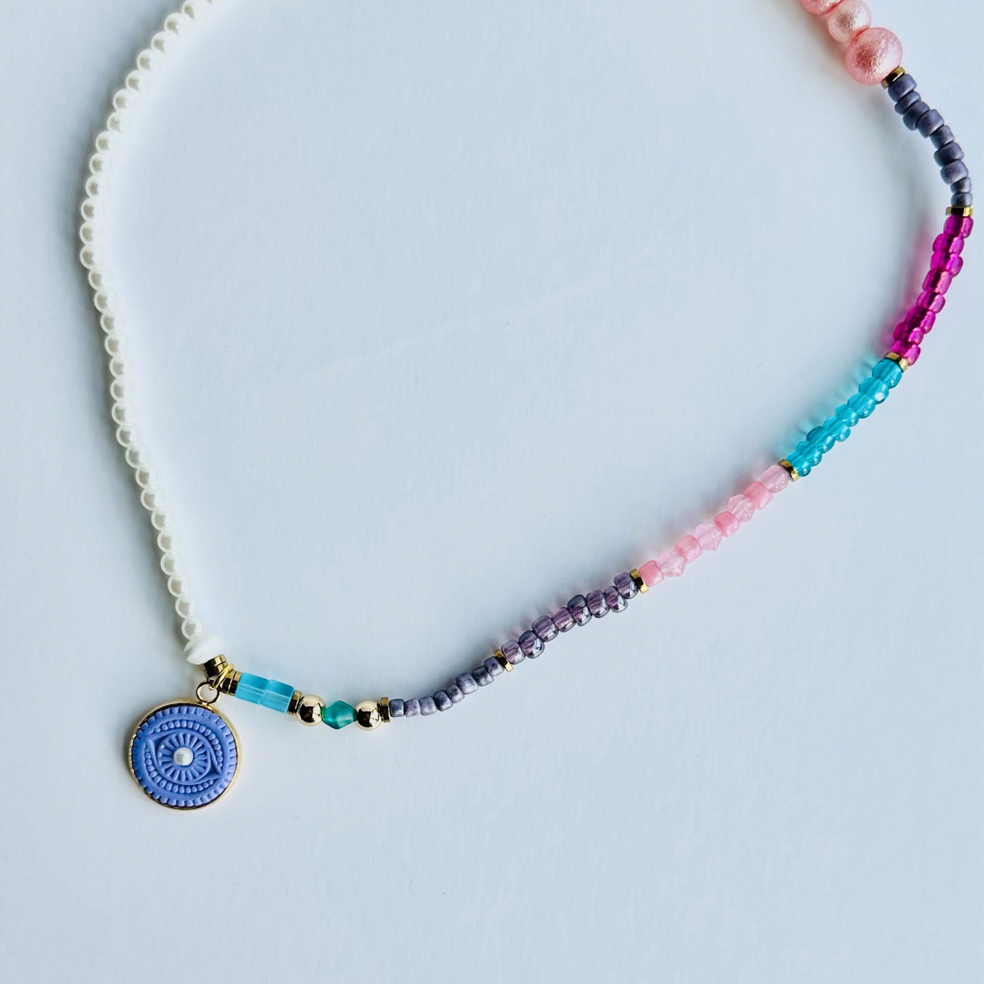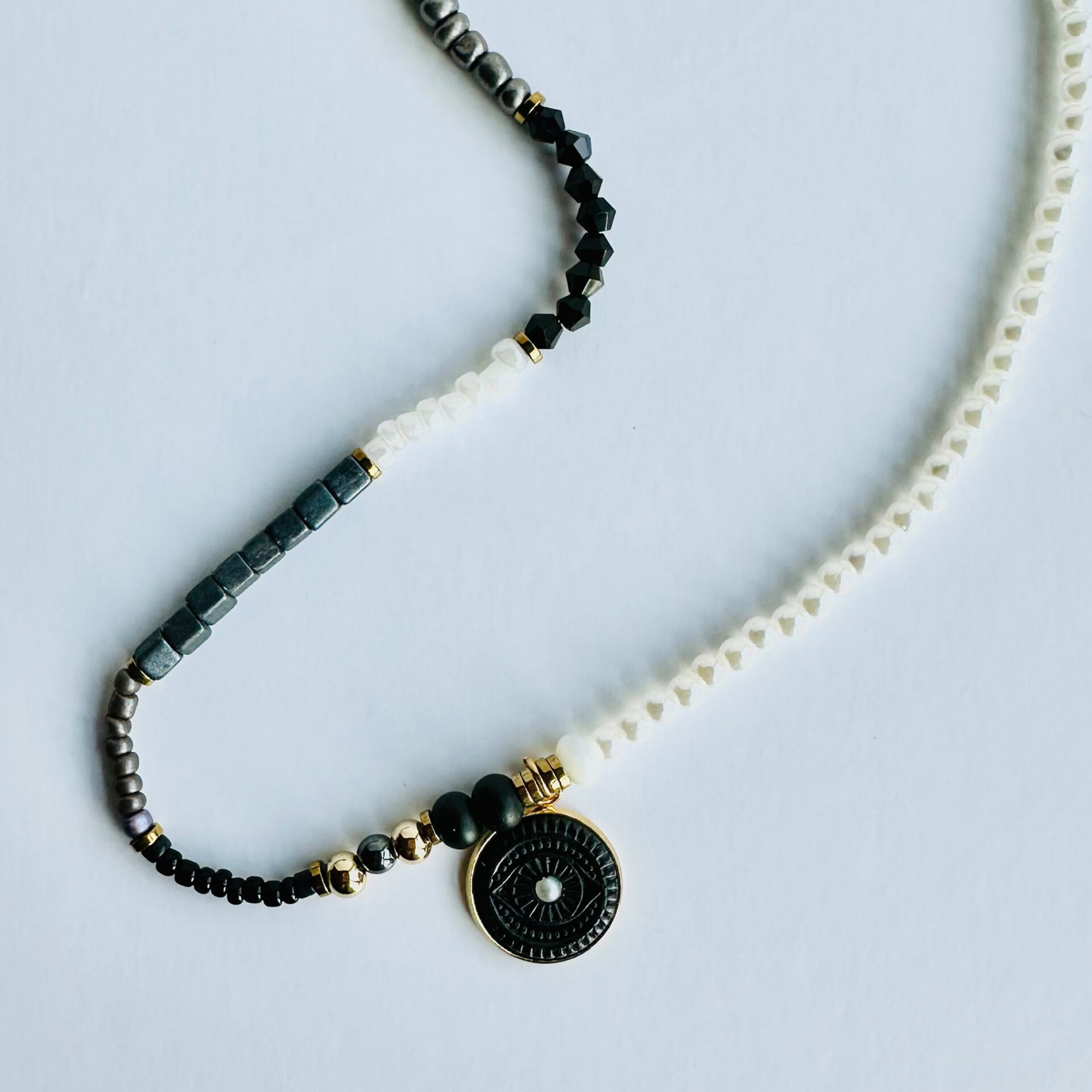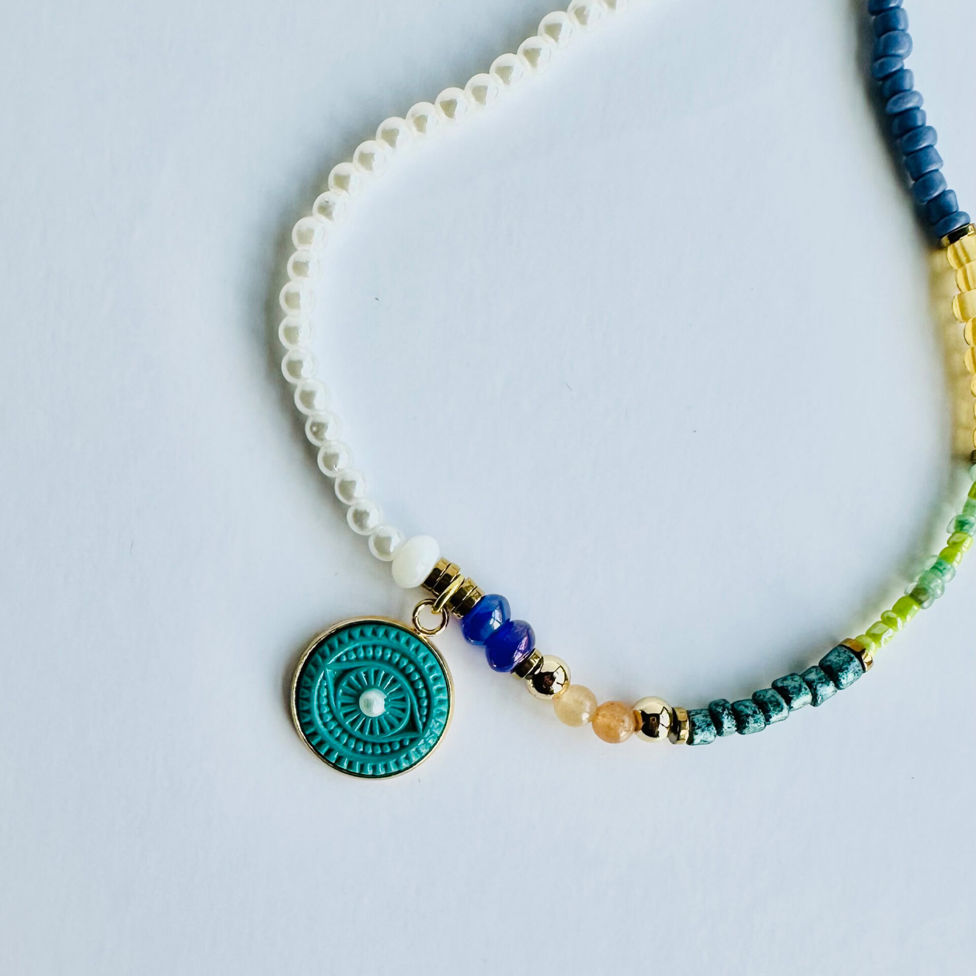 The pendant rests on a 14-inch beaded choker, designed to hug the collarbone — an energetic bridge between the voice and the heart. Each bead is chosen for its texture, contrast, and meaning, creating a unique frame for the Mystic Eye and adding layers of personal symbolism.
