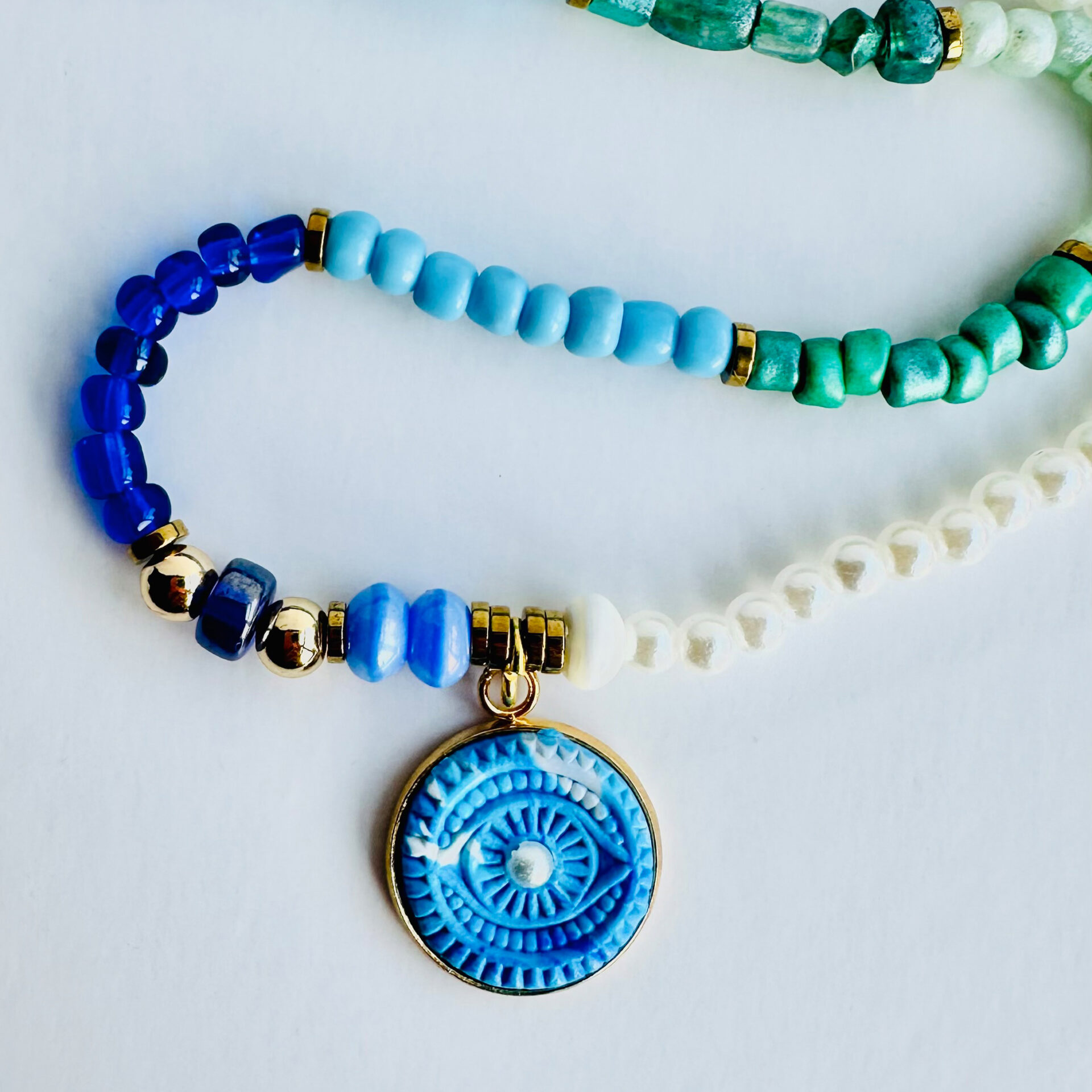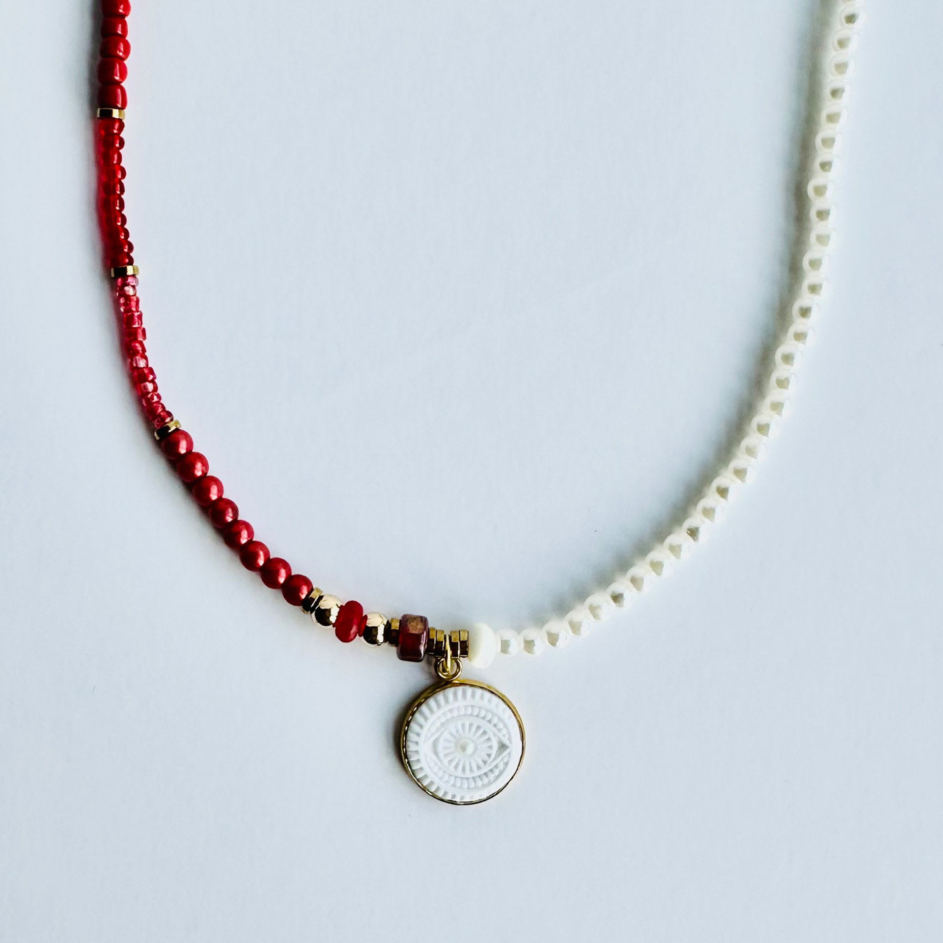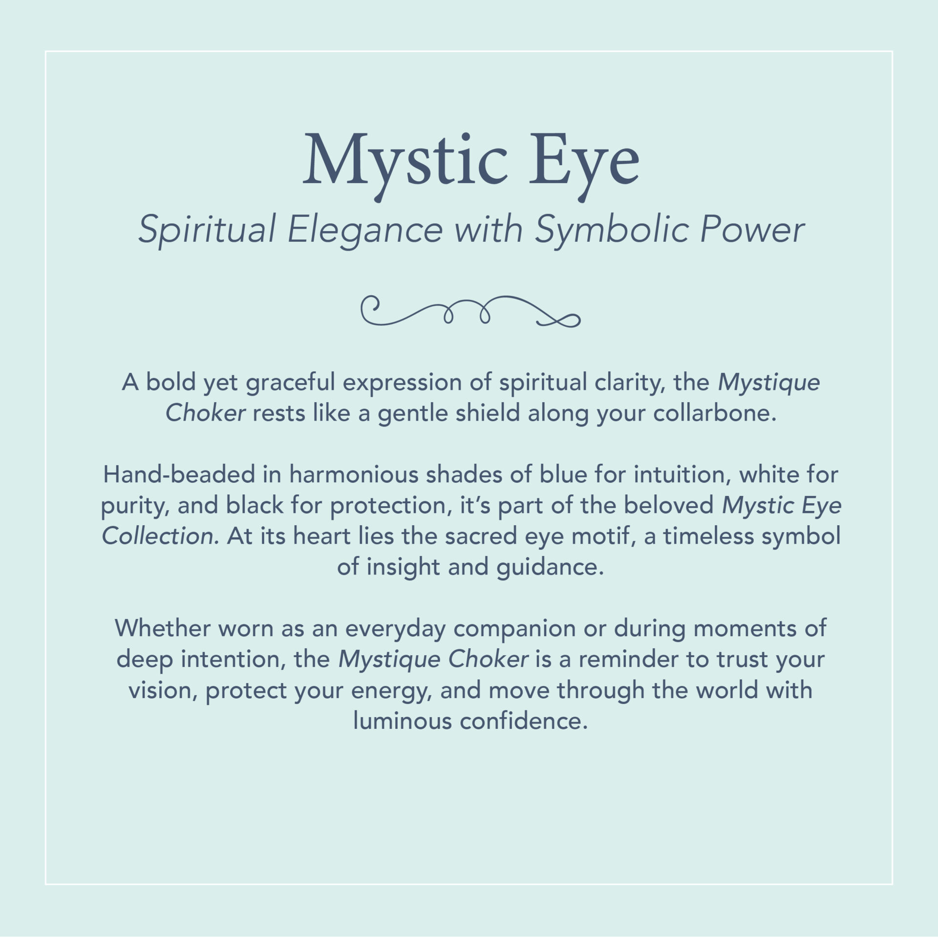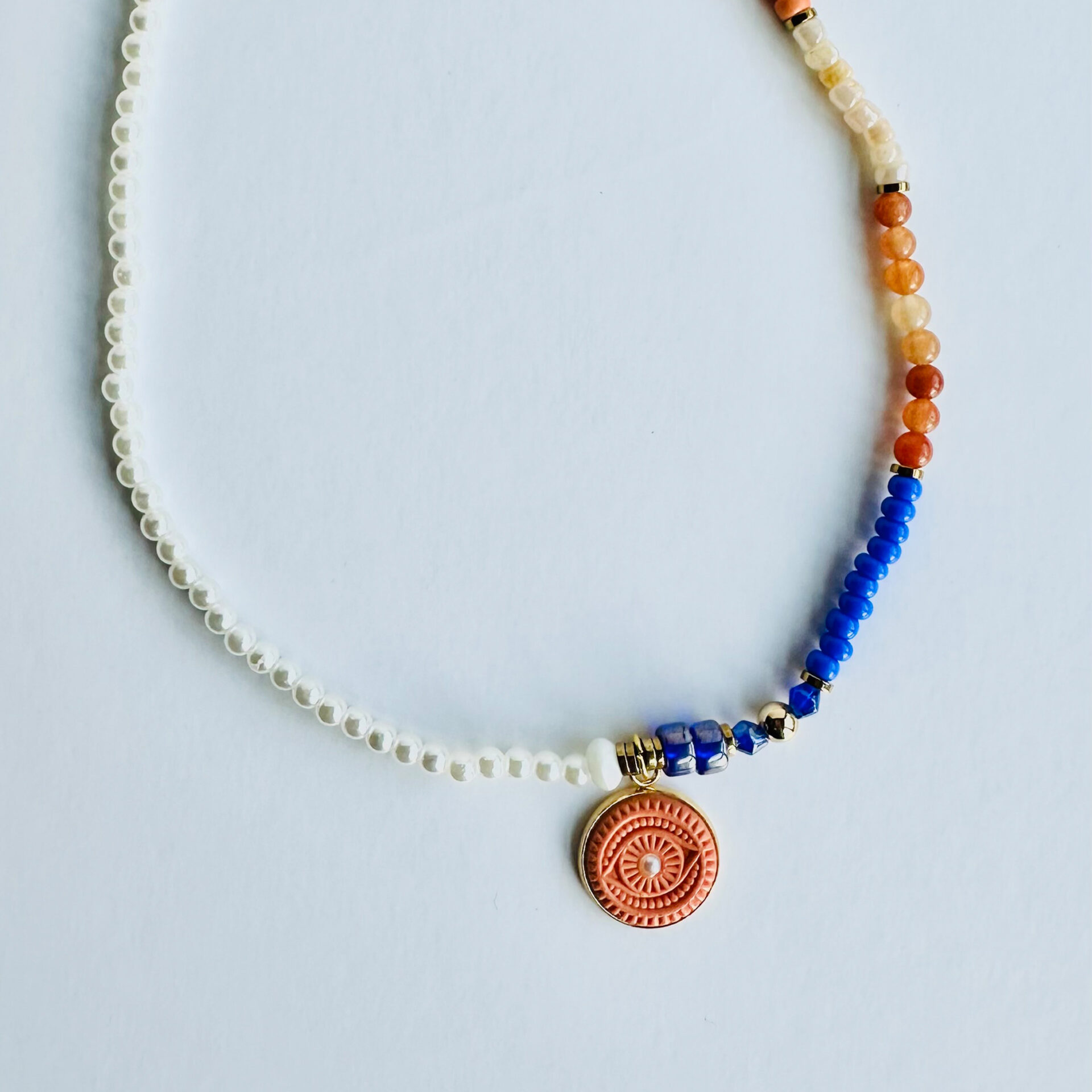 The pendant rests on a 14-inch beaded choker, designed to hug the collarbone — an energetic bridge between the voice and the heart. Each bead is chosen for its texture, contrast, and meaning, creating a unique frame for the Mystic Eye and adding layers of personal symbolism.