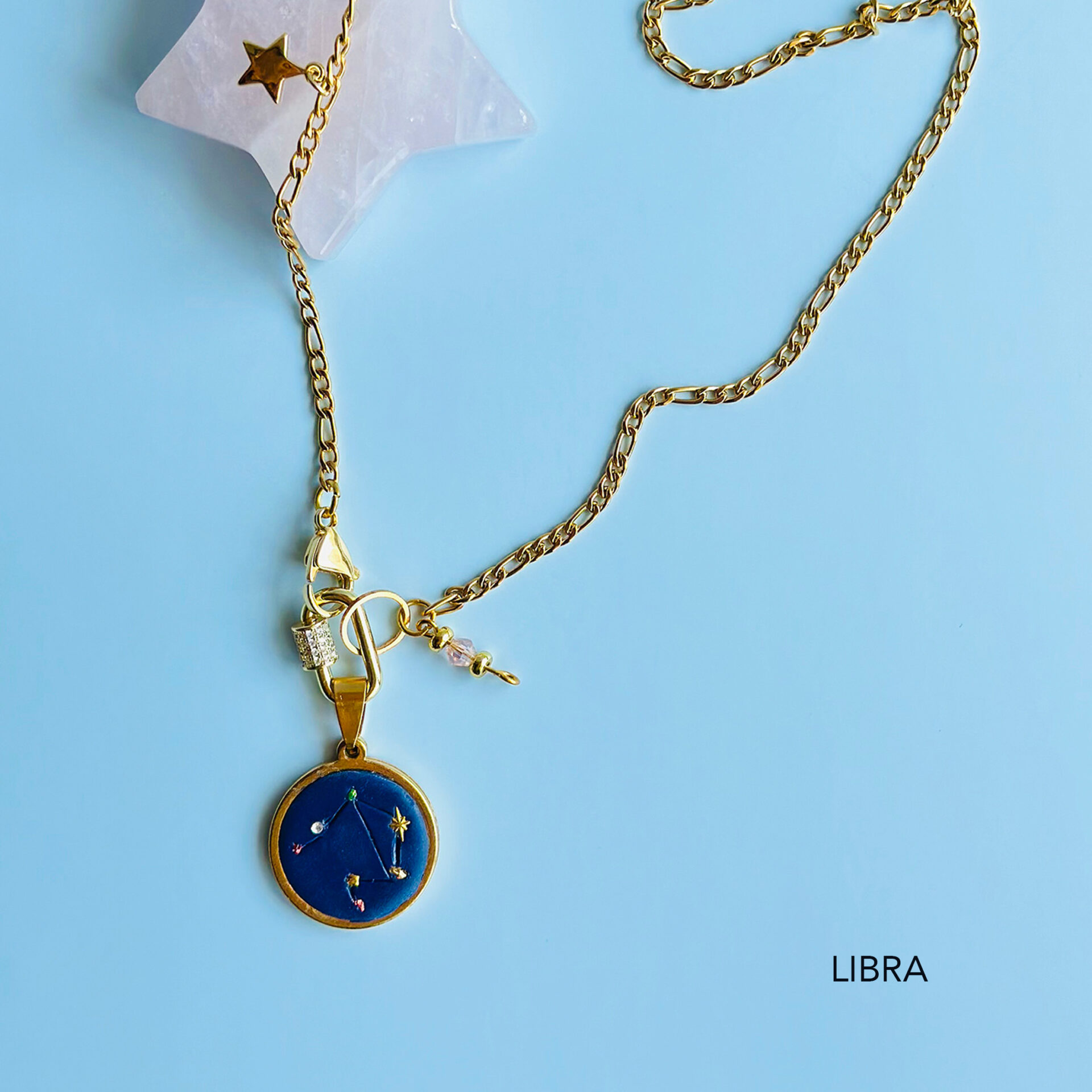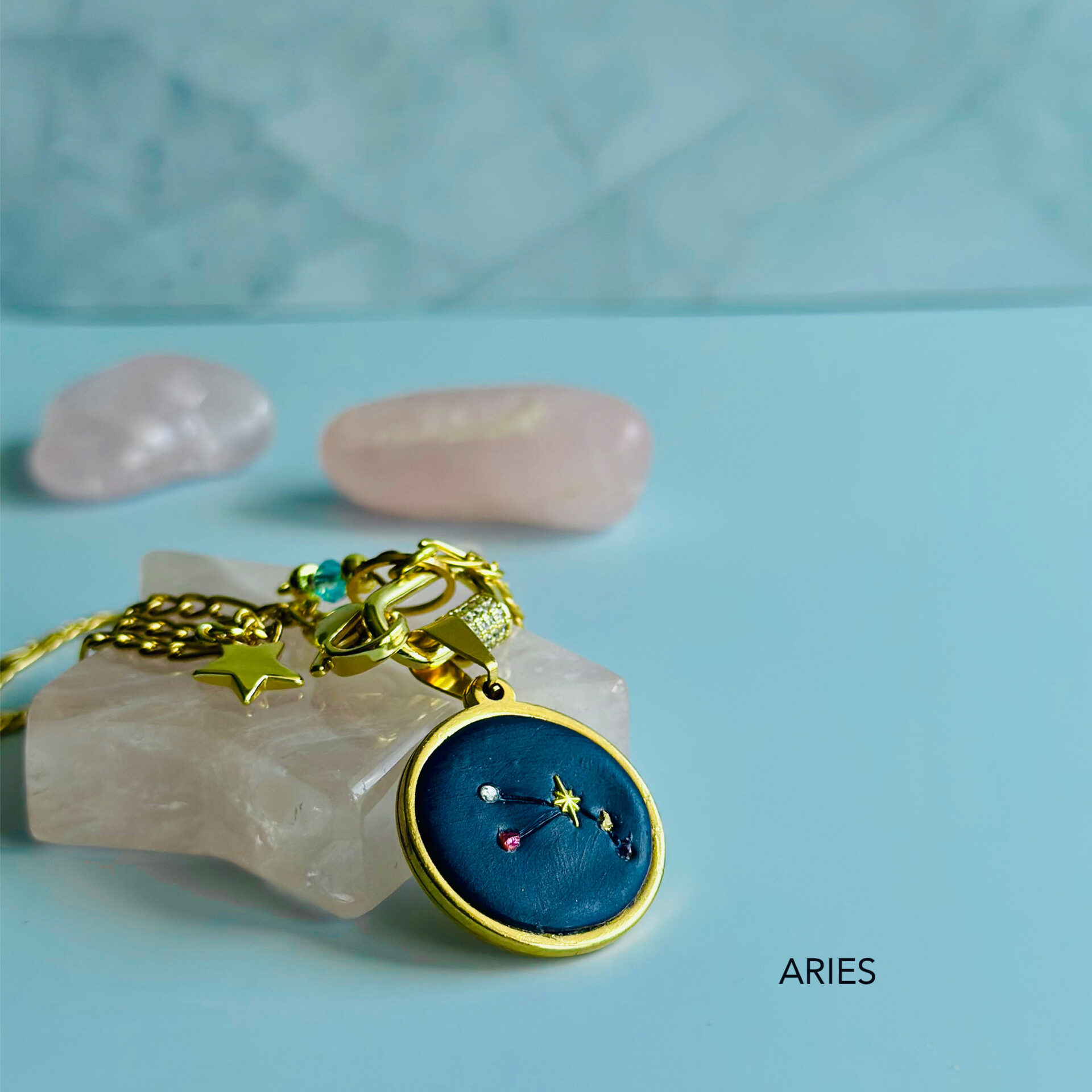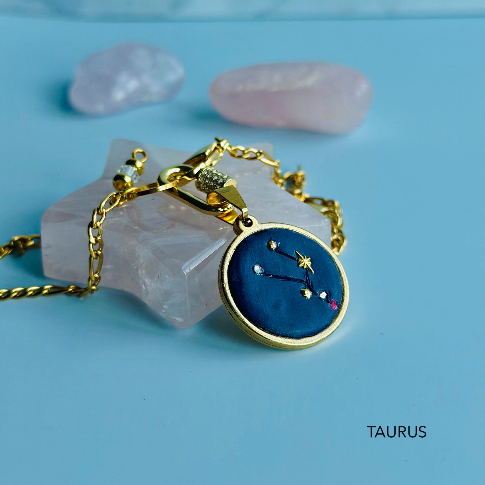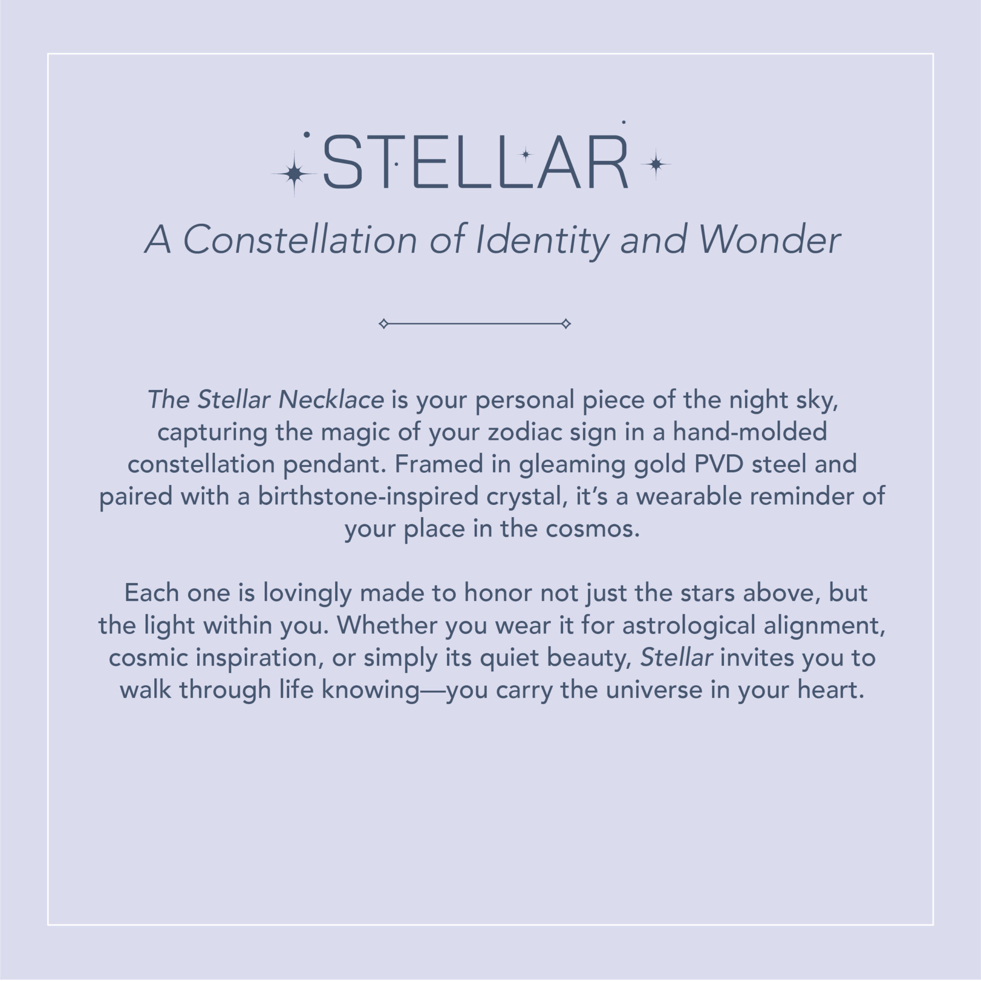 The Stellar Necklace is a love letter to the cosmos — and to you. Inspired by the quiet magic of the night sky, this necklace captures your zodiac constellation in a shimmering gold charm, delicately set into a midnight blue polymer clay pendant. A glimmering crystal glass birthstone and a tiny 18K gold-plated star add layers of celestial detail, making this piece both deeply personal and impossibly charming.
